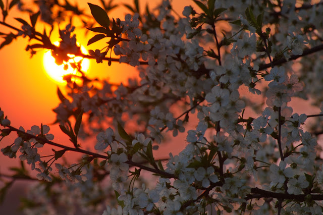 Jeszcze tamtego roku chciałem wykonać zdjęcia zachodzącego słońca na tle kwitnących sadów, wówczas się nie udało aż do maja tego roku, kiedy przypadkiem w okolicy Ropczyc odkryłem uroczy sadek z widokiem na zachód, wystarczyło jedynie poczekać aż niebo się zarumieni, a złota kulka zmieni barwę na czerwoną, a wszystko to przyozdobione subtelną bielą. Byłem w tym miejscu dwa dni później ale nie było już tak doskonałego efektu ponieważ delikatne płatki wiśni zaczęły już opadać - teraz pora na jabłonie, które obficie kwitną.